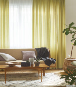 帝人フロンティアの高機能素材「FCOT®」を使用したカーテン。特殊な繊維構造により花粉やPM2.5などの微小粒子をキャッチすることで、外からの侵入を防ぎます。キャッチした花粉等は洗濯で除去することで、長期的に機能を保つことができます。