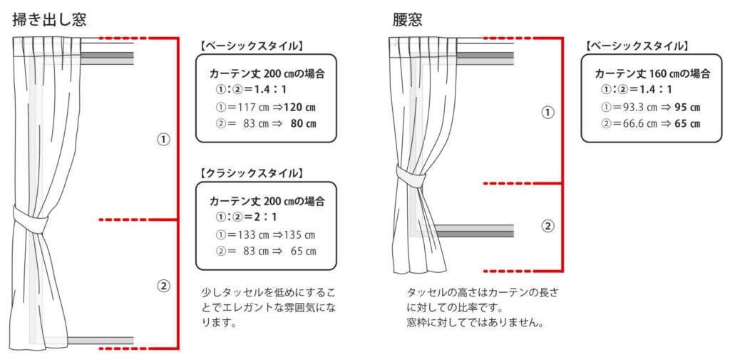A. 基本的にはカーテン丈に対して上:下=1.4:1の高さがバランス良いです。例えば丈200cmなら裾から約80~85cmが目安。手の届きやすさや使い勝手も考慮して、お好みで微調整しましょう。