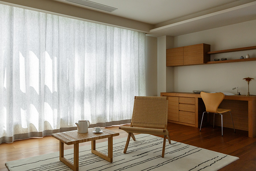 - 眺望を活かしたい窓は通常レースで透け感を残す。