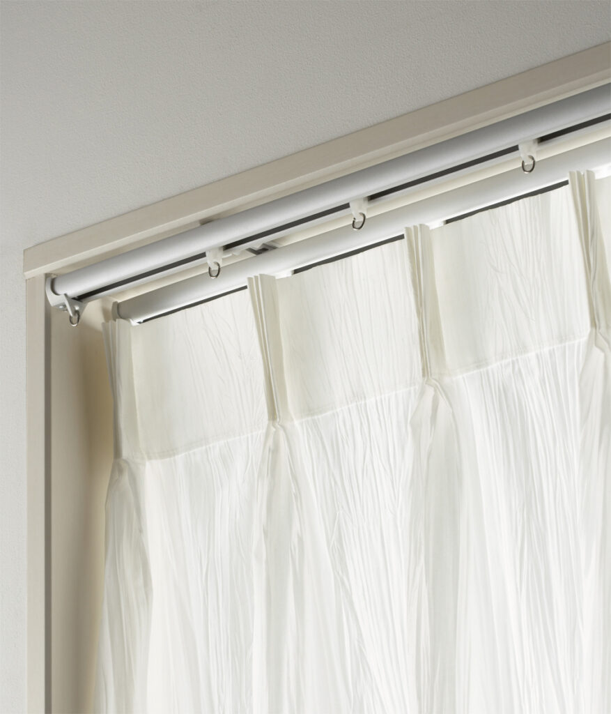 また、装飾レールのようにレールの厚みがあるものは枠内に収まらないことが多いため、枠内には機能性レール(薄いレール)を選ぶことになります。ダブルレール(ドレープとレースの2本)を設置したい場合は、枠内の奥行き(スペース)が足りず、カーテン同士が干渉しやすくなるため、シングルレールでの運用が推奨されます。
