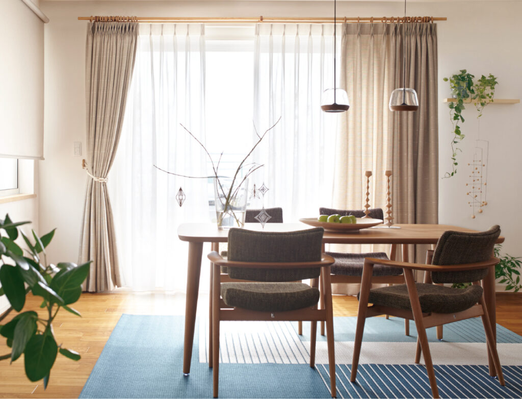 …家族が集まる場所なので、「居心地の良さ」「インテリアとの調和」を最優先に。採光性のあるレース+ほどよく厚みのあるドレープカーテン、もしくはロールスクリーンやバーチカルブラインドとの組み合わせなど、お好みのテイストに合わせて選びます。